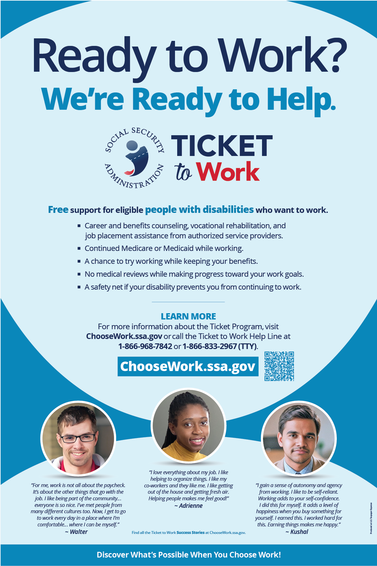 Choosing to work can change your life. The Ticket to Work Program and Work Incentives allow you to keep your benefits while you explore employment, receive vocational support and gain work experience. If you are age 18 through 64 and receive Social Security Disability Insurance (SSDI) and/or Supplemental Security Income (SSI) you already qualify! To figure out if Ticket to Work may be right for you, visit www.ssa.gov/work.